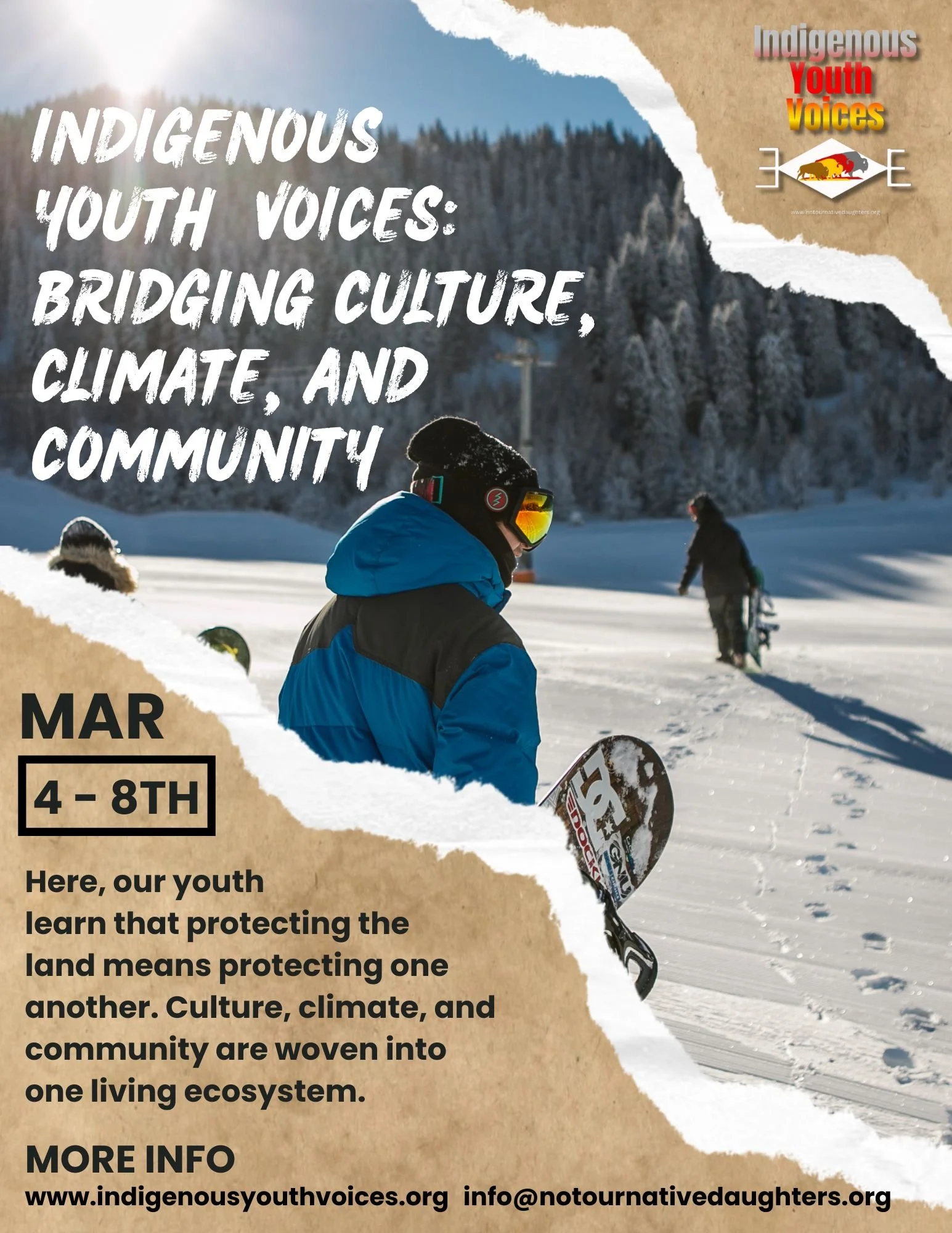 The program begins on Thursday, March 5, with a snowboarding experience that integrates outdoor education, traditional ecological knowledge, and guided circle talks centered on identity, confidence, and leadership. On Friday, March 6, youth will participate in the Youth Climate Summit, engaging in Indigenous-centered climate education, environmental justice discussions, and community-based solutions. The week concludes on Saturday, March 7, with Indigenous snowshoeing, land-based learning, and healing activities, including cultural teachings, wellness experiences, and circle discussions focused on mental health, suicide prevention, MMIWR awareness, and protecting one another.